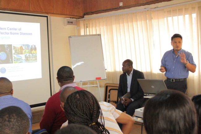 Upon the invitation of CRID’s expert in Arbovirus related diseaes Dr. Basil Kamgang, Professor at the University of Florida, USA and Director CDC Southeastern Regional Center of Excellence for Vector Borne Diseases, Dinglasan, delivers a talk to scientists and PhD students at CRID on the topic “Silent dengue virus infections in natural populations of Aedes…