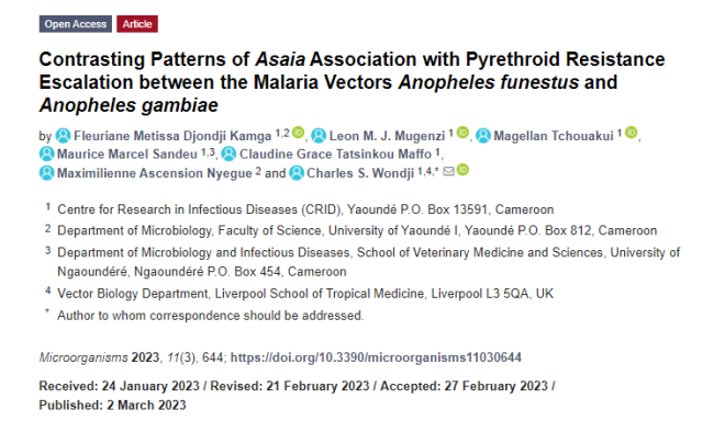 PUBLICATION: Contrasting Patterns of Asaia Association with Pyrethroid Resistance Escalation between the Malaria Vectors Anopheles funestus and Anopheles gambiae by Fleuriane Metissa Djondji Kamga & al