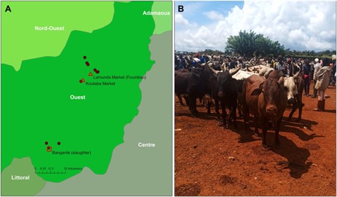 Fig. 4. Location of cattle markets relative to seropositive sampling sites (human and cattle). (A) Triangles and squares indicate the location of the cattle markets in Foumban and Bangangte respectively. Red points represent cattle herders positive to CCHFV antibodies, while (B) illustrates a cattle market scene, demonstrating the density and proximity of herders and cattle…