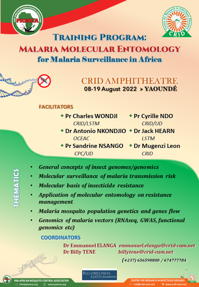 A training on the Molecular Entomology of Malaria will be organise at CRID’s premises in odza, Yaoundé, Cameroon from the 8th to 19th August, 2022