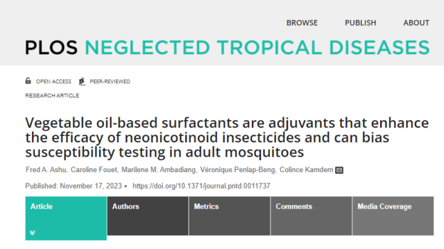 In the present study, using standard test procedures, we report that relatively cheap surfactants such as vegetable oil esters or soap at 0.5 or 1% v/v mixture with neonicotinoids can selectively enhance the potency of neonicotinoids against mosquito populations. This can bias the test incase resistance is present in the tested population at a low level. From another point of view, implementing vector control tools containing neonicotinoids and relatively cheap vegetable oil soap as adjuvant, can help increase the impact of the intervention. However, this can only be done prior to proper investigation given that, results from our study equally show adding these adjuvants to pyrethroids does not significantly increase their potency. Indeed insecticide resistance is a threat to progress achieved in the fight against malaria through the use of Long-Lasting Insecticidal nets (LLINs) and Indoor Residual Spraying (IRS). In order to mitigate this phenomenon and move towards eradication, new molecules are being sorted for and their efficacy evaluated. As a result of the identification of these new chemistries, the World Health Organization (WHO) standard operating procedure for testing insecticide susceptibility in adult mosquitoes has been updated to include new active ingredients. For example, to evaluate the susceptibility to clothianidin, a neonicotinoid or to flupyradifurone, a butenolide, adult mosquitoes are not exposed to the active ingredient alone, but to a mixture containing a surfactant which helps in solubilization and enhances take up of the pesticide. Despite the recommended use of this adjuvants, few studies have been carried out to evaluate the interaction between insecticide and these compounds generally described as “inert”.